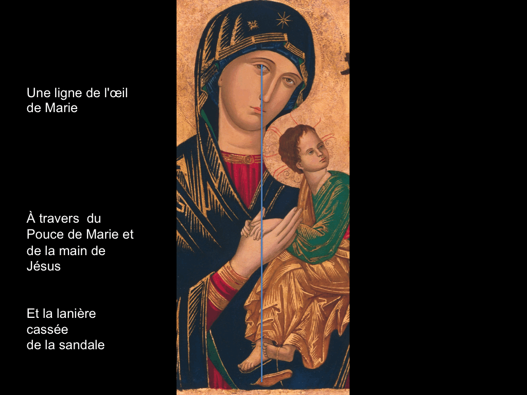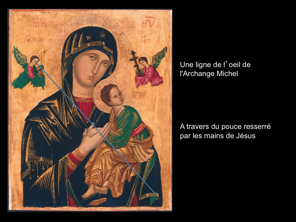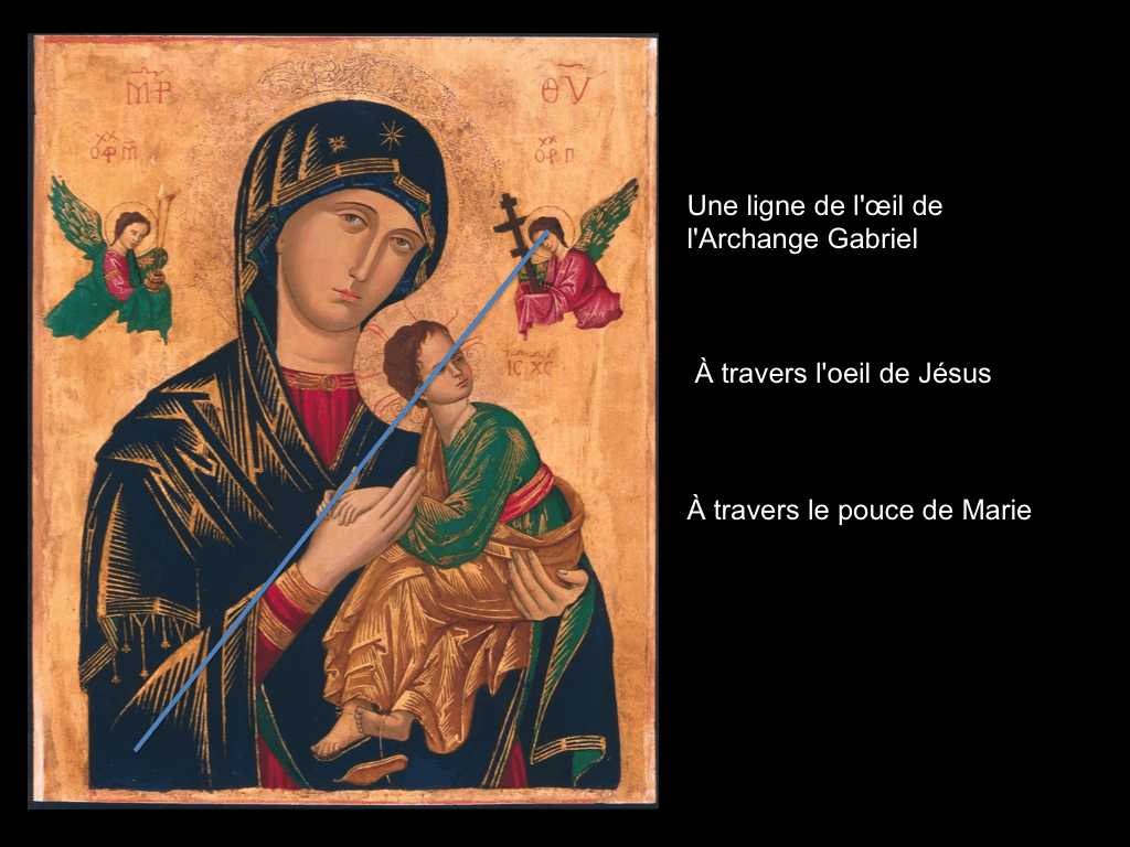 Ton regard n’est pas tourné vers ton fils Jésus, mais vers nous. Lui regarde vers l’archange Gabriel qui lui présente la croix et les clous. Avec tous ces signes de la passion, il n’est pas étonnant que plusieurs personnes te surnomment « icône de la terrible vision ».