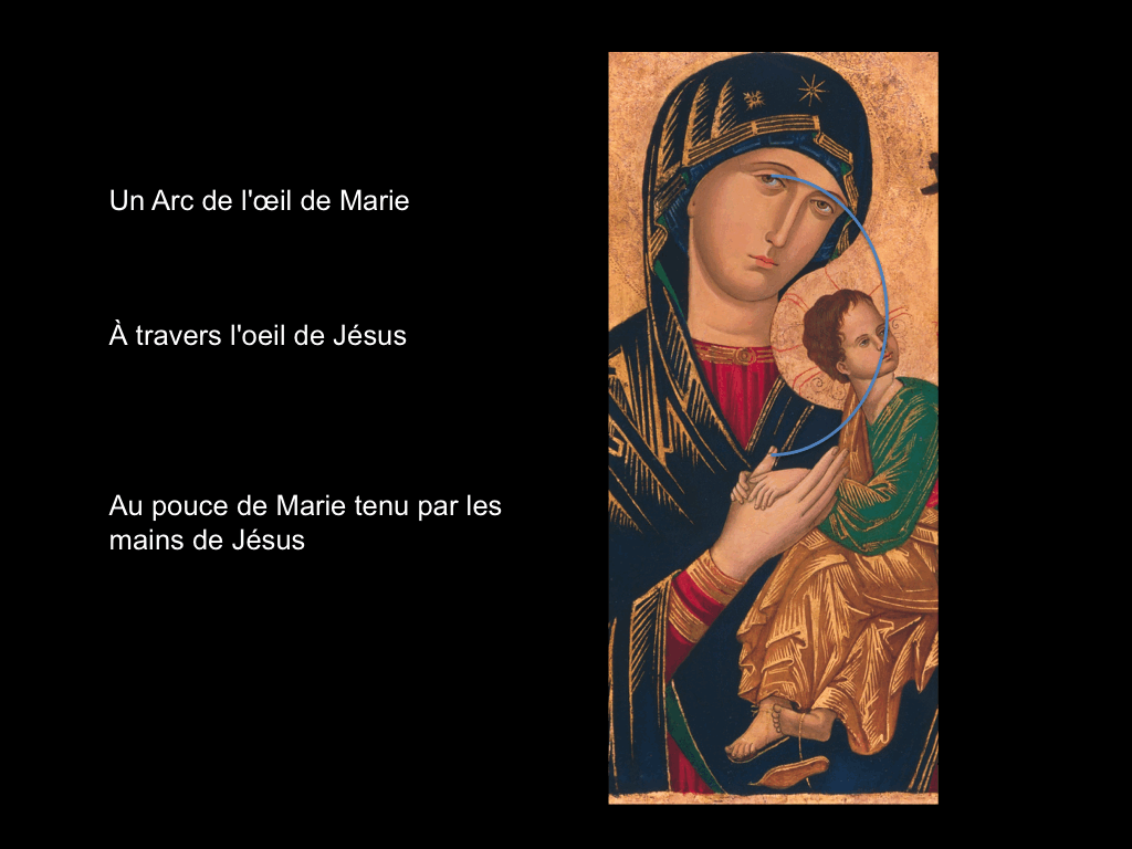 Marie, nous constatons que ton regard ne nous quitte jamais. Tu es Perpétuel Secours, parce que tes yeux, de quelque côté qu’on les regarde, gauche ou droite, se posent sur nous, comme une maman qui ne veut pas perdre de vue son enfant. Ils nous suivent partout, quelles que soient nos conditions de vie, nos écarts, défauts et reculs; ton regard est l’expression de ton amour inconditionnel de mère pour tous tes enfants. (Is 49,15; Mc 10,21; Mt 9,36)
