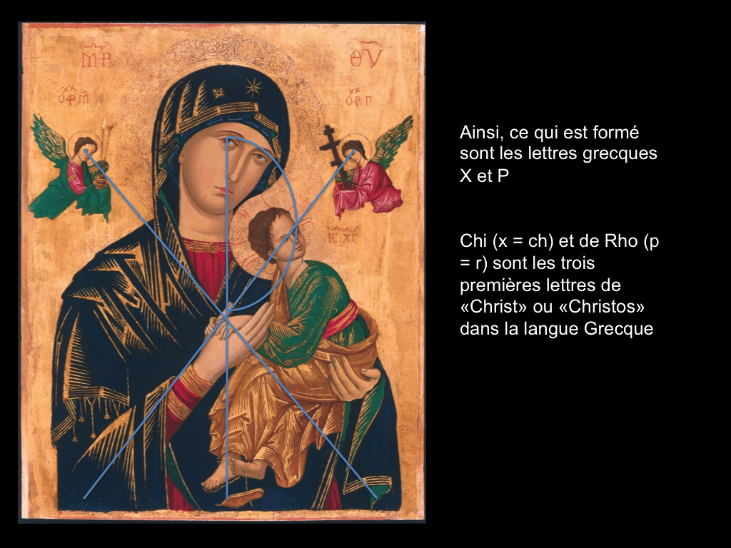 De chaque côté de l’auréole qui entoure ton visage sont dessinées de grandes lettres en grec. Ce sont les initiales des mots : Mère de Dieu. Et au-dessus des anges, on voit écrit leur nom, à gauche, l’archange Michel, et à droite, l’archange Gabriel. Juste à droite de la tête de ton Fils, on aperçoit les lettres de son nom : Jésus Christ.
