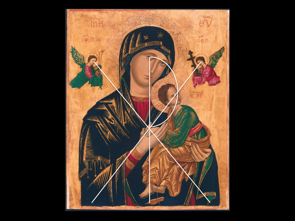 Ton icône, ô Marie, présente plusieurs signes du salut. Certes, ta figure maternelle occupe la plus grande partie de l’icône, situant le Fils de Dieu dans sa condition humaine; il s’est fait petit. Par ailleurs, au centre, ta main droite montre le Sauveur. Plus loin, les anges présentent les instruments de la Passion. Et, comme fond de tableau, la lumière glorieuse du fond d’or (Ph 2,6-11).